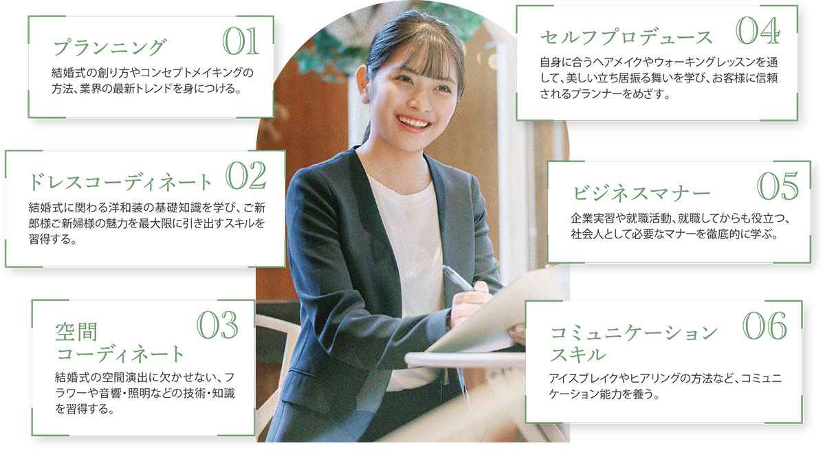 あらゆる専門知識を駆使して提案するスキルが必要です。本校ではプランニング以外にも、ドレスやフラワーなどの